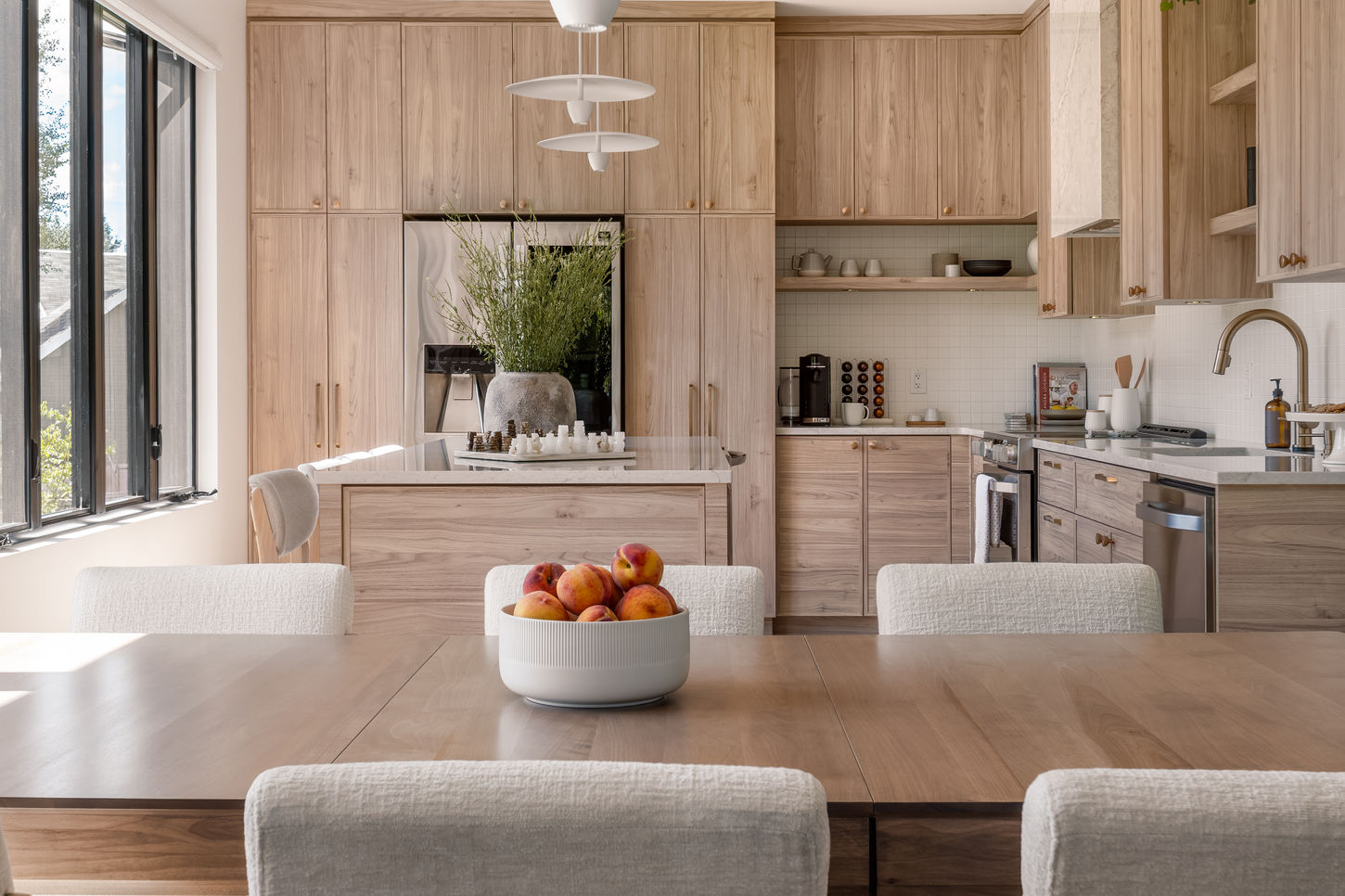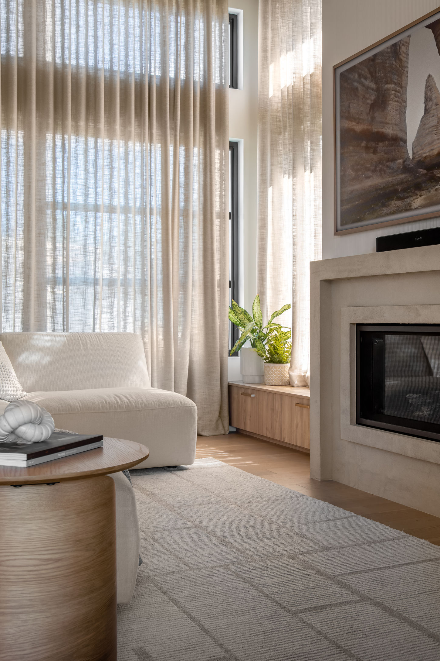 Le point de départ du projet est né d’une image d’inspiration — un assemblage de matériaux publié sur notre site web — qui a servi de fil conducteur pour développer une ambiance douce, chaleureuse et cohérente. Nous avons sélectionné l’ensemble des matériaux, des planchers, du mobilier, des accessoires décoratifs ainsi que le mobilier intégré sur mesure.
